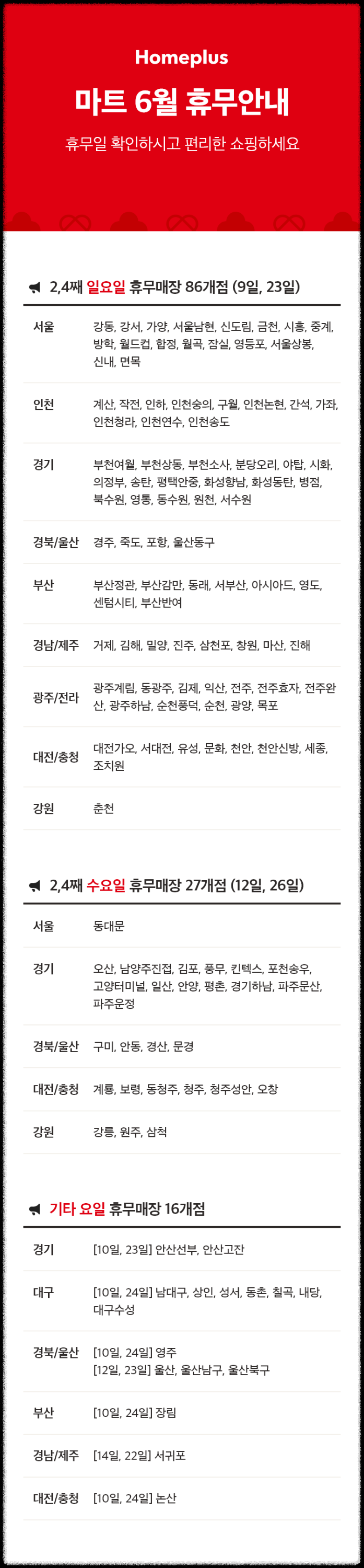 - 전국 홈플러스 6월 휴무일 안내