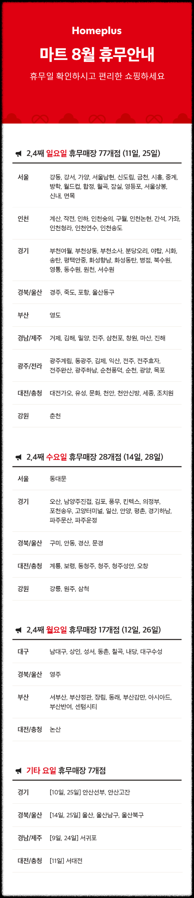 - 전국 홈플러스 8월 휴무일 및 영업시간 안내