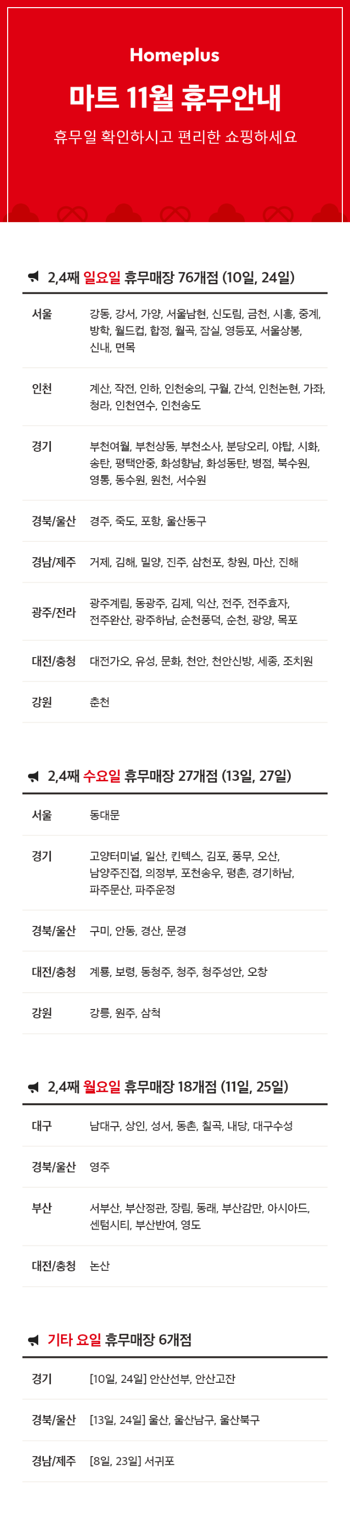 - 전국 홈플러스 11월 휴무일 및 영업시간 안내
