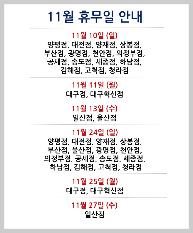 11월 10일(일) 양평점, 대전점, 양재점, 상봉점, 부산점, 광명점, 천안점, 의정부점