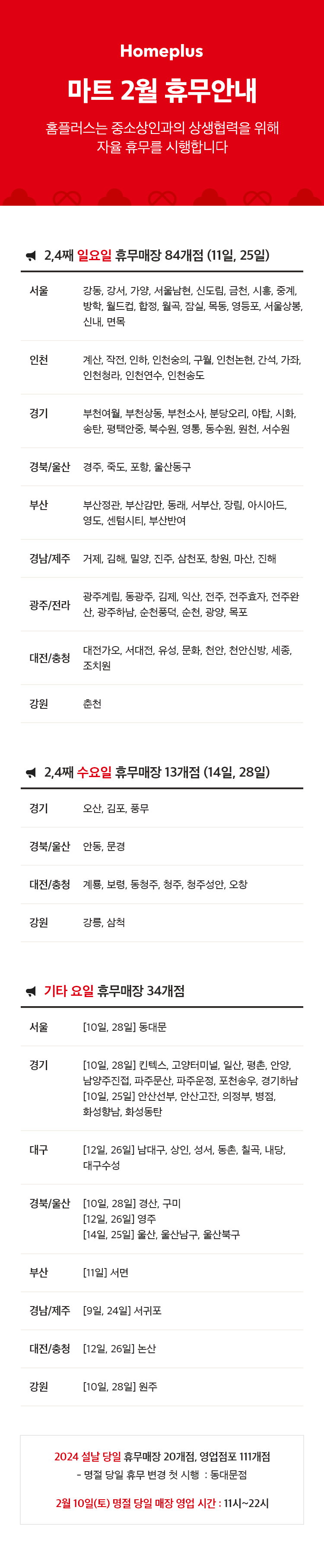 전국 홈플러스 2월 휴무일을 지역별로 알려드리니, 방문하시려는 지역을 찾으신 후, 휴무일을 확인해 보시기 바랍니다.